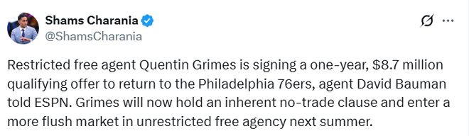 北京时间10月2日,据名记Shams报道,费城76人队受限制自由球员昆汀-格雷姆斯已决定接受一份为期一年、价值874万美元的资质报价。